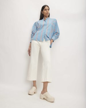 The comfort of a raglan meets refined poplin. Featuring a stand collar. with deep raglan sleeves and a shirttail hem. The sleeves gather into a longer cuff to create a slight balloon shape.