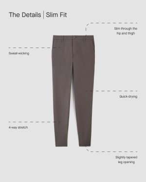 So we made a pair with all the technical-pant features—they’re sweat-wicking. quick-drying. and have 4-way stretch—plus an authentic chino look designed for everyday wear. Slim fit features a slim fit through the hip and thigh. slightly tapered leg. and regular rise.