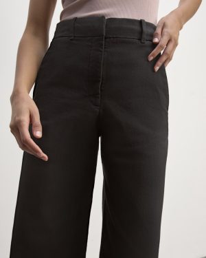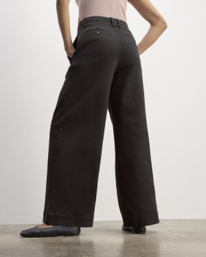 This piece features a wide leg. high rise. front angled pockets. and back welt pockets with button closure. in organic cotton.