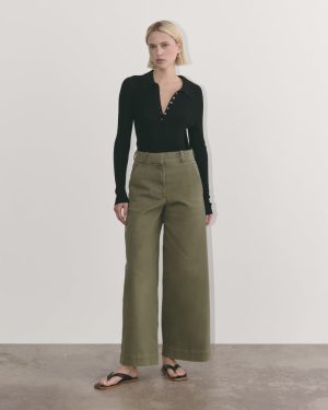 This piece features a wide leg. high rise. front angled pockets. and back welt pockets with button closure. in organic cotton.