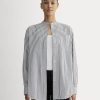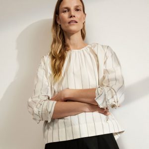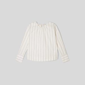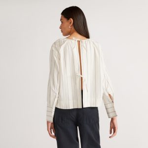 Shirting takes on new moods with this easy Poplin Breeze Shirt. Made with poplin cotton. our signature gathered crewneck at the front makes way to a fully open back with a neat self-tie at the neck. Gentle dropped shoulders and a buttoned cuff that can be rolled up keep things low-key and oh-so chill.Cotton poplin is densely woven. making it both durable and breathable. also giving it a crisp. cool feel.