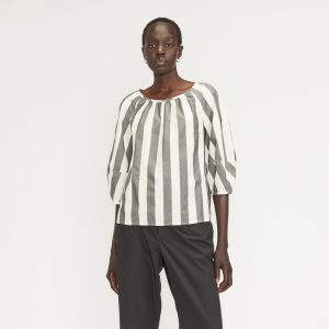 Top off your look with The Poplin Scoop-Neck Top. Featuring a gathered open crew neck and 3/4 length balloon sleeves. it has a relaxed fit that’s easy to tuck in or wear loose. It’s made with 100% breezy cotton. Cotton poplin is densely woven. making it both durable and breathable. also giving it a crisp. cool feel.