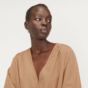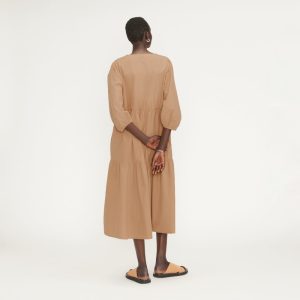 Add instant polish to your day with The Poplin Tiered Dress. A maxi-length dress. it features gathered tiers at the bust and just below the waist. creating a relaxed. oversized A-line silhouette. It has a V-neckline and 3/4 length sleeves with a subtle balloon shape. and side pockets. It’s made with 100% cotton to keep things light and breezy. Cotton poplin is densely woven. making it both durable and breathable. also giving it a crisp. cool feel.