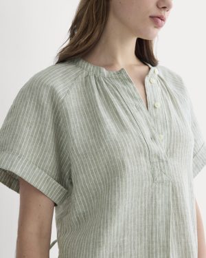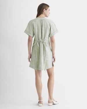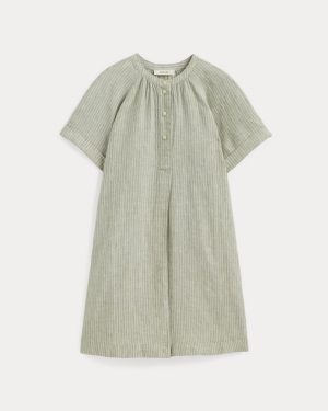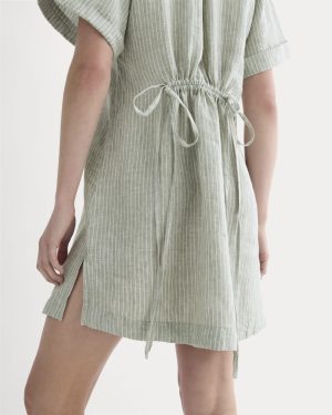 It features a band collar with a front button placket. short. wide sleeves. and hits at mini length. A drawstring at the back lets you easily adjust the silhouette. Made with 100% European Flax™ Linen. it makes getting dressed a breeze. Style with loafers. sneakers. or summer sandals—it all works.