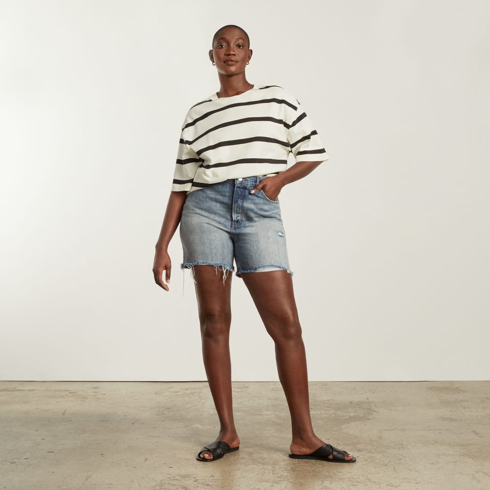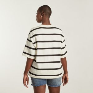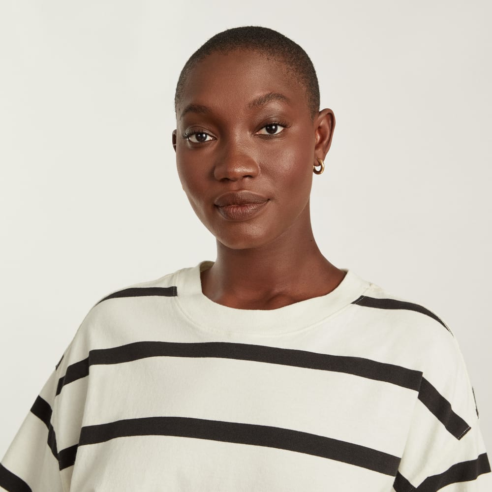 Made of 100% cotton. the Premium-Weight Relaxed Tee features dropped shoulders. a classic crewneck. longer sleeves. and an intentionally boxy. oversized fit. Size down for a less boxy fit. The best part? It’s made of organic cotton. which is better for the planet and you. so you can look good and feel good.