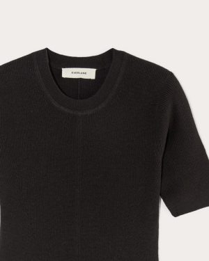 This piece features a classic crewneck. waisted fit. short sleeves. with a midi length—in a premium ribbed cotton. merino blend.