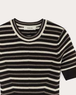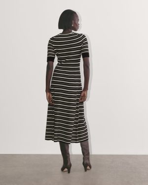 This piece features a classic crewneck. waisted fit. short sleeves. with a midi length—in a premium ribbed cotton. merino blend.