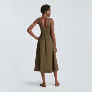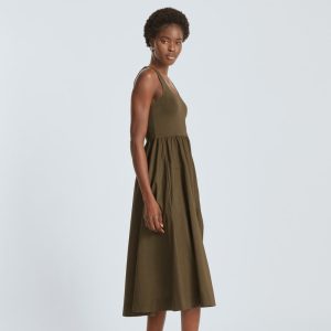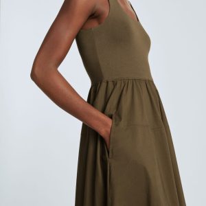 The Riviera Dress features a comfortable knit top and a voluminous woven bottom. The top portion is made with 94% ECOVERO™ viscose and a touch of stretch. while the skirt is made with 100% cotton for all-day breathability. The pinnacle of versatility.