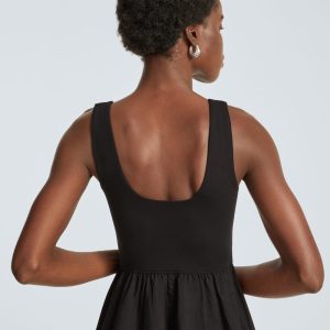 The Riviera Dress features a comfortable knit top and a voluminous woven bottom. The top portion is made with 94% ECOVERO™ viscose and a touch of stretch. while the skirt is made with 100% cotton for all-day breathability. The pinnacle of versatility.