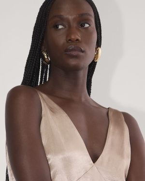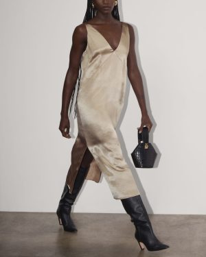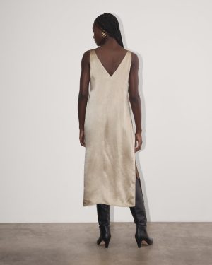 Its v-neck. maxi length. and body-skimming silhouette. with front seam detailing. in a satin fabric made of Naia™ Renew. gives minimalism. but with maximalist effect. Easy to style and endlessly wearable. from knee-high boots to kitten heels. topped with a fuzzy sweater or oversized blazer. or simply worn solo with simple jewelry. be prepared to want to wear this dress everywhere.
