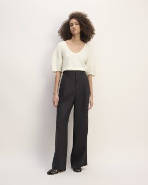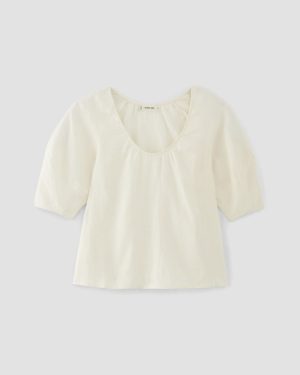 This piece features a relaxed fit. short sleeves with horizontal seam for volume. a scoop neck. and is made from 100% linen.