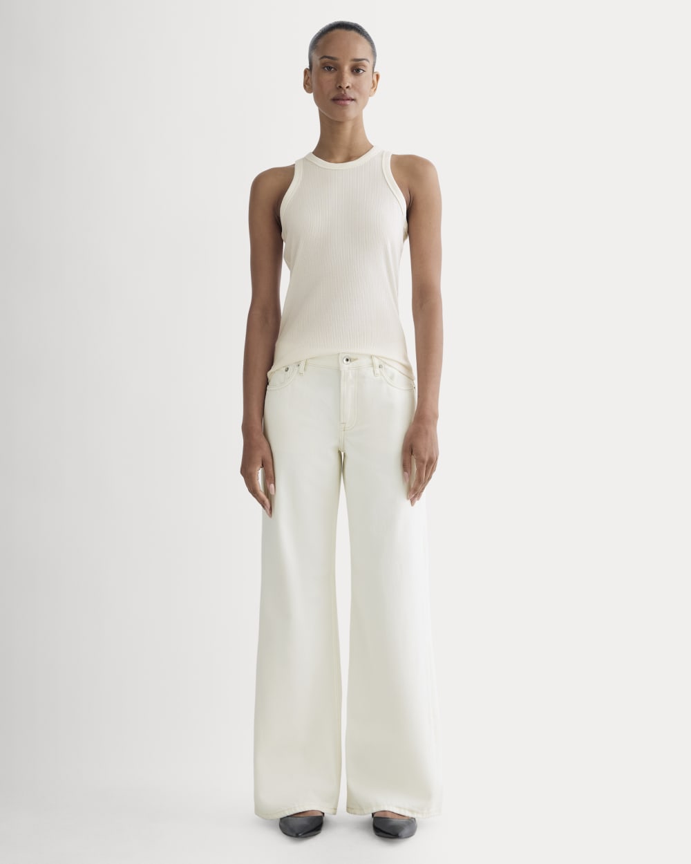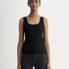 The perfect balance of sporty yet elevated. this tank features a crew neckline and racerback silhouette in a soft ribbed fabric with a subtle sheen. Channel ’90s minimalism with tailored black pants and barely-there sandals.