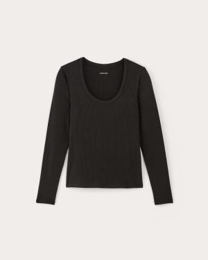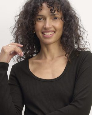 This piece features a U-neck. fitted silhouette. and long sleeves in our ribbed Shimmy fabric that offers an elevated softness and subtle sheen.