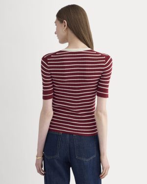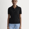 A short-sleeve crewneck—with a roll trim and long placket. it features a fine rib stitch and ribbed sleeve cuffs. Made with our ultra fine merino yarn. it’s preppy perfection. ready to work with your most relaxed or most tailored pants.
