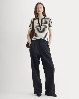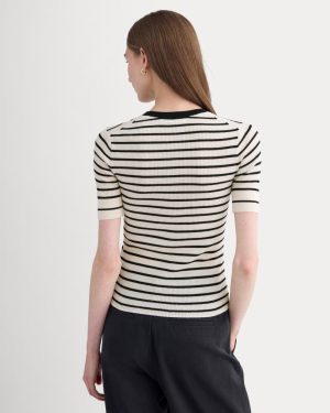 A short-sleeve crewneck—with a roll trim and long placket. it features a fine rib stitch and ribbed sleeve cuffs. Made with our ultra fine merino yarn. it’s preppy perfection. ready to work with your most relaxed or most tailored pants.