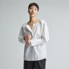 This piece features an oversized fit. shirt collar. front button closure and cuffs. short sleeves. and straight hem.