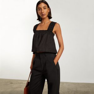 The Smocked Linen Cami has ultra-feminine features like a ruffled neckline and sleeves with a billowy shape that pairs perfectly with any high-rise bottom. Plus. it’s made of 100% linen which makes it more wrinkle resistant. extra breathable. and ideal for warm-weather days.