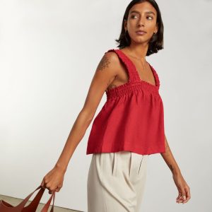 The Smocked Linen Cami has ultra-feminine features like a ruffled neckline and sleeves with a billowy shape that pairs perfectly with any high-rise bottom. Plus. it’s made of 100% linen which makes it more wrinkle resistant. extra breathable. and ideal for warm-weather days.
