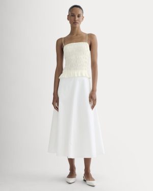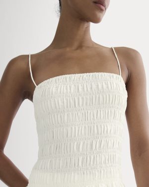 A smock tank. it features spaghetti straps and ruching along the hem for a little extra flair. Perfect for dressing up date night or a day at the beach. style with your favorite midi skirt. shorts. or linen pants.