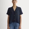This piece features an oversized fit. short sleeves. collarless tunic design with hidden buttons at center front placket in Supima® cotton.