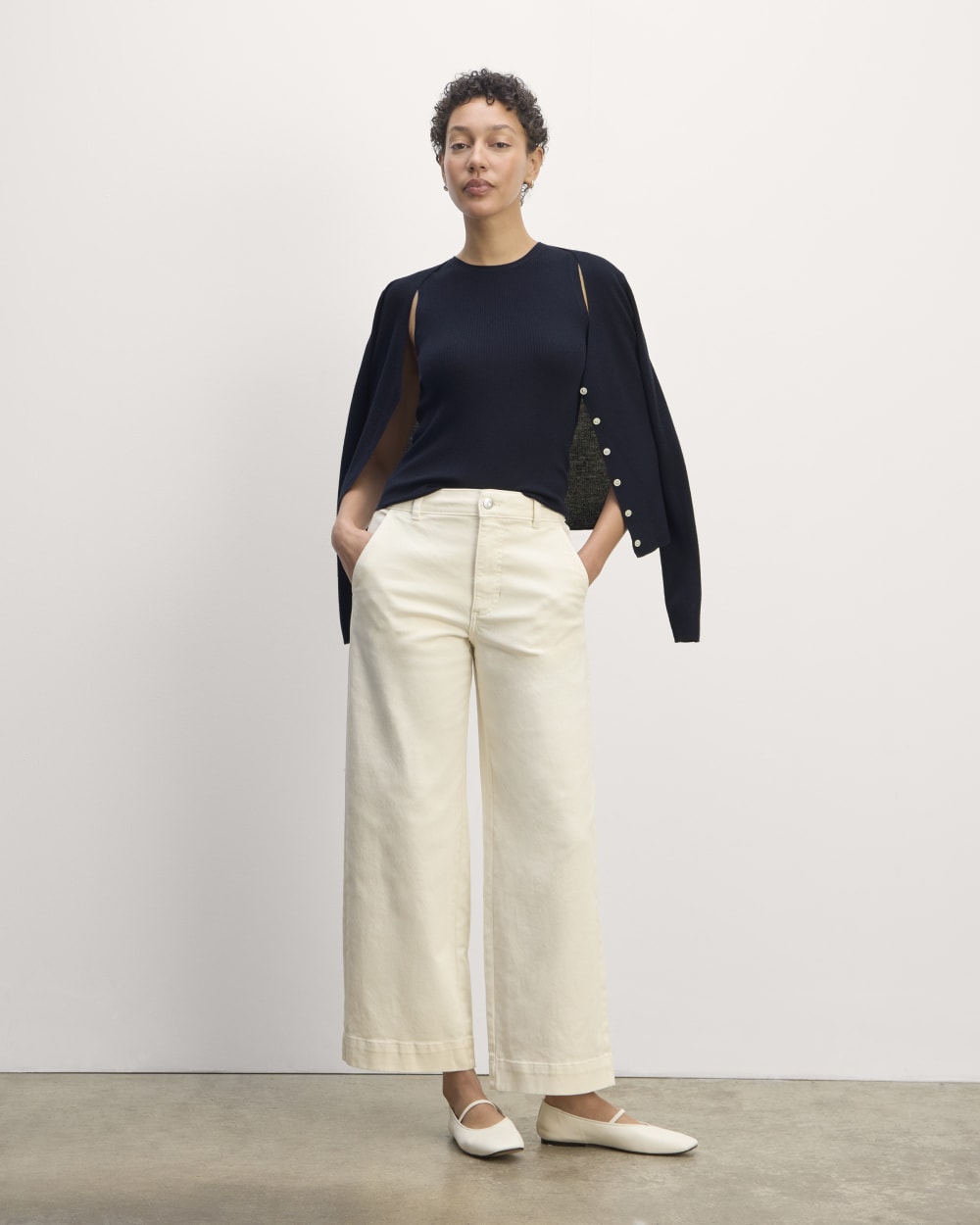 With a form-fitting silhouette. and ultra-soft fabric. it features a classic neckline. fallback shoulder. and jersey detailing in the underarm. We like pairing this with the Fine Merino Ribbed Cardigan.