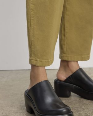 This piece features a high-rise silhouette with a statement curve leg that hits right at the ankle. with front angled pockets. two back patch pockets. and made of organic. lightweight cotton with a touch of stretch for a body-hugging feel.