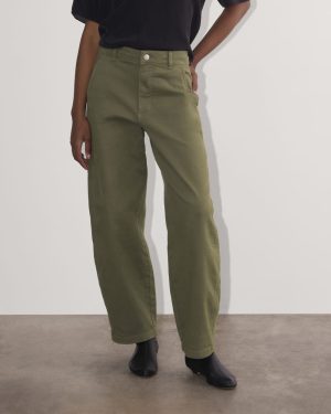 This piece features a high-rise silhouette with a statement curve leg that hits right at the ankle. with front angled pockets. two back patch pockets. and made of organic. lightweight cotton with a touch of stretch for a body-hugging feel.