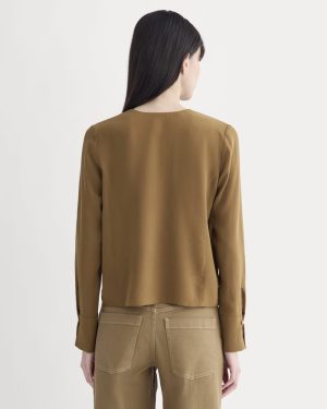 This V-neck shirt features a notched cuff. button front. and side slits for comfort. Made with our Clean Silk—that’s actually washable. for more beauty and less waste. Tuck it into high-rise trousers for the office. or pair with jeans for an easy weekend mood.