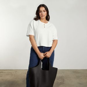 The Vintage Henley Hemp Tee features elongated short sleeves for a throwback twist and a cropped. boxy fit. It’s made of hemp. which is an incredibly strong fiber that’s longer lasting. with a lower environmental impact.
