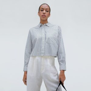 Made from high-twist. 100% cotton yarn in a soft twill weave. the Way-Short Shirt in Silky Cotton features a point collar. a clean button front. one patch pocket. and a cropped shape that pairs perfectly with high-waisted bottoms. Wear it with jeans for a classic look. or pair it with something stretchy for an easy (yet super-flattering) outfit.