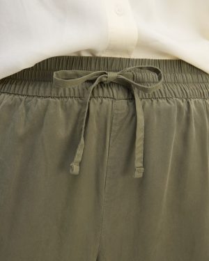 This piece features an elastic waist with drawstring closure. wide leg. and front angled pockets.